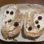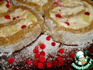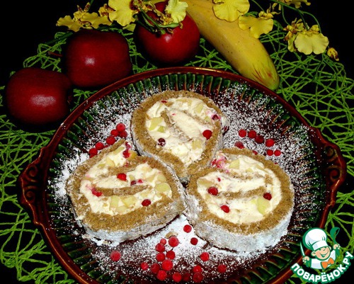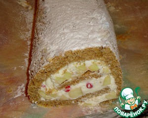 А этот с яблоками. Сверху рулет можно присыпать сахарной пудрой. С яблоками я чуть перестаралась. Рулет тяжеловат и не очень круглый получился.