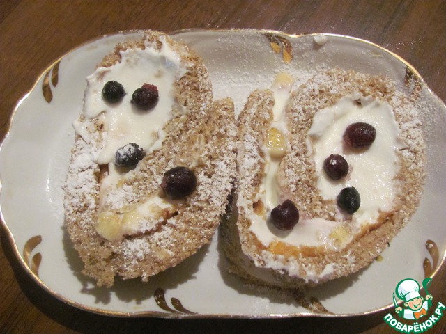 В холодильник рулет не убираем. Пусть останется на столе для лучшей пропитки. (Этот рулет у меня с бананом).