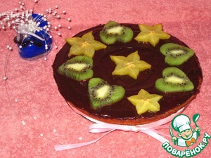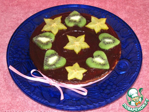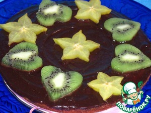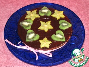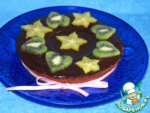 Кекс сверху промажем шоколадной глазурью. Поставим в холодидьник на 10 минут. В это время нарежем фрукты. Вынем готовый кекс и украсим по своему усмотрению. Я сделала сердечки из киви, и четыре звезды - капитанское звание.