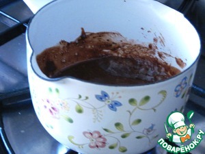 Приготовим шоколадную глазурь. Смешаем сметану, сахар, какао и варим несколько минут постоянно помешивая, пока смесь загустеет. Положим в нее кусочек масла, поварим еще несколько минут.