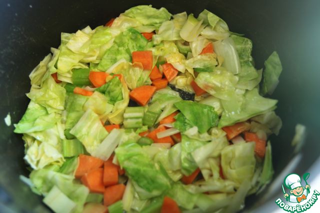 Берем глубокую кастрюлю для супа, кладем 2 ст. л. сливочного масла, обжариваем овощи минут 10-ть, чтоб они чуть чуть смягчились.