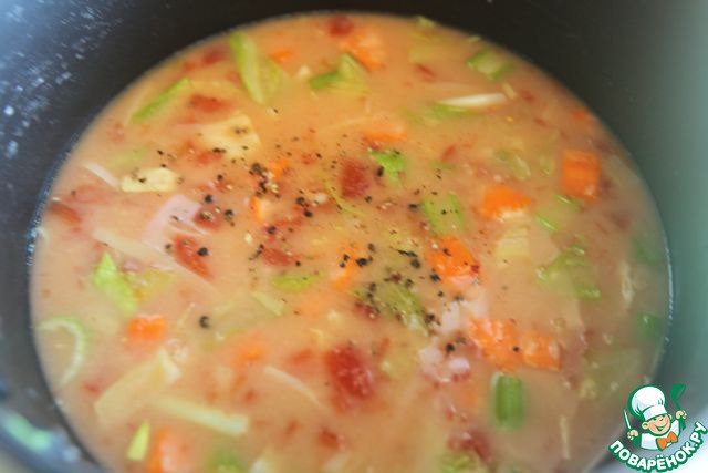 После того, как наш суп готов, берем блендер, погружаем его в суп и взбиваем до хорошей кремообразной массы. Пробуем на соль и перец. -