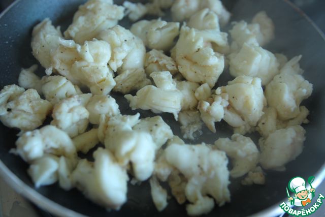 Достаем мясо лобстера, нарезаем на кусочки, не сильно большие, но и не сильно маленькие. Если у вас креветка либо раковые хвосты, их не режем. Хорошо разогреваем сковороду, кладем пару столовых ложек сливочного масла и обжариваем мясо 3-5 мин.