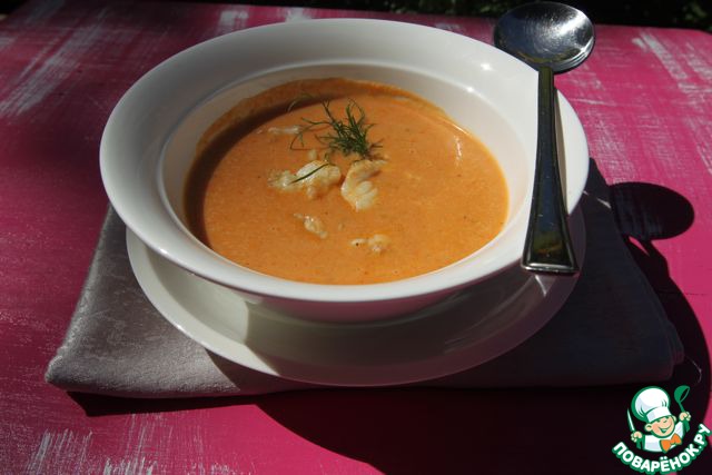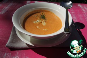 Разливаем суп по тарелкам, кладем кусочки обжаренного лобстера, украшаем укропом и наслаждаемся!