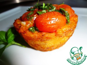 В небольшие формы для кексов, предварительно смазав их маслом, укладываем слоями: рис с томатами, белый рис и снова рис с томатами. Помидоры черри разрезаем пополам и слегка втапливаем их в рис, сбрызгиваем бальзамическим уксусом.