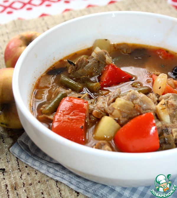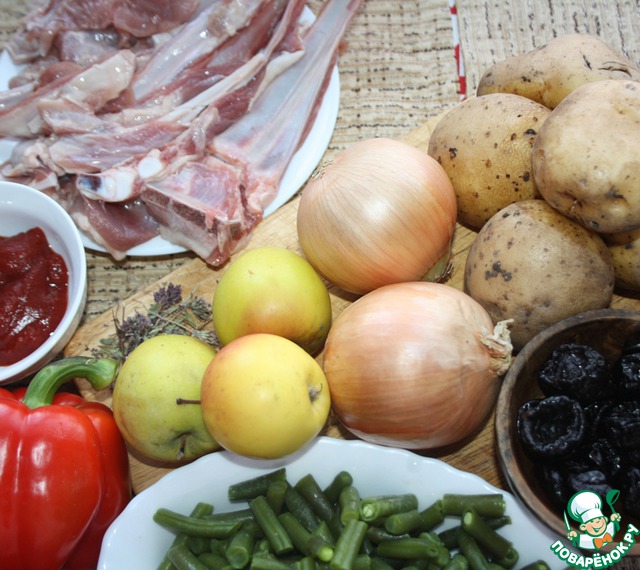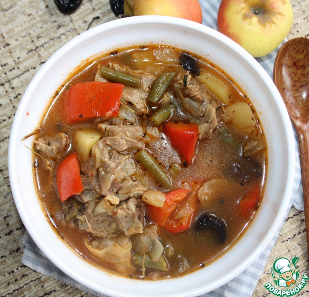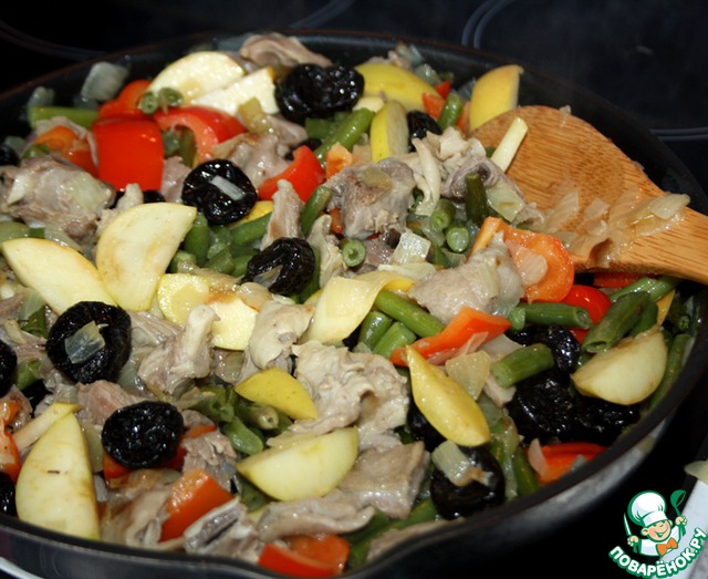 • Поочередно добавляем в сковороду с мясом и луком перец, фасоль, яблоки, чернослив (в оригинальном рецепте рекомендуют взять подкопченный чернослив, но в наших краях такой «зверь» не водится и я использовала обычный сухофрукт без косточек).