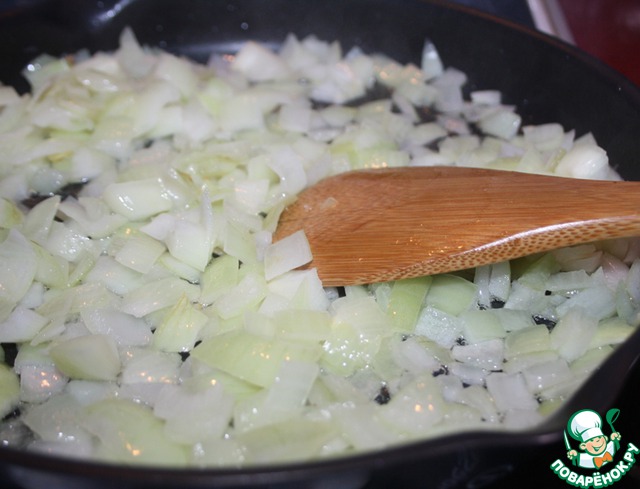 • Пока варится мясо, очистить и измельчить лук (я режу на кубики примерно 1х1 см) и обжарить его около 3-х минут.