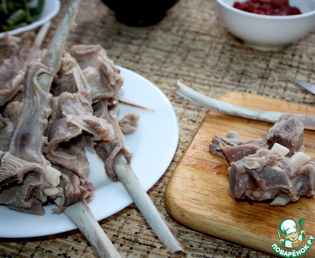 • По окончании времени вынуть мясо из бульона, бульон процедить. Снять мясо с костей (если у вас баранина на косточках). Порезать на кусочки. Добавить к луку и обжаривать еще около 2-х минут.