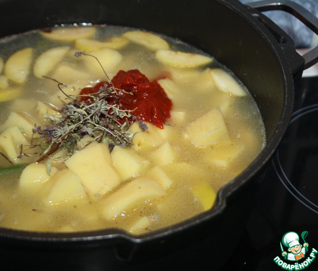• Обжаренную смесь поместить в бульон, добавить картофель, томатную пасту чабрец и базилик. Довести до кипения и варить на среднем огне 15-20 минут.