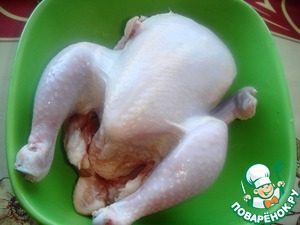 Посолить цыпленка снаружи, выложить в форму для запекания, налив немного воды. Кожу чуть-чуть смазать оливковым маслом, запекать до золотистой корочки при температуре 160 градусов, примерно, 50 минут.