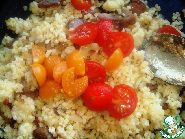 Физалис нарезать на четвертинки, помидорки черри на половинки, перемешать с пшенкой и жареным луком с колбасой, посолить по вкусу.