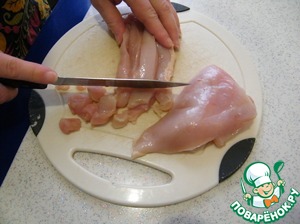 Нарезаем куриное филе мелкими кусочками.