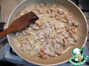 Обжариваем филе вместе с предварительно нарезанным луком.