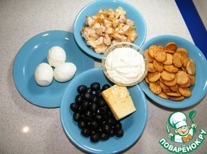 Подготавливаем необходимые ингредиенты: обжаренное филе, яйца, майонез, оливки, сыр, крекер.