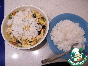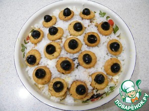 В качестве украшения укладываем сверху слой риса. На слой риса раскладываем крекер с оливками.