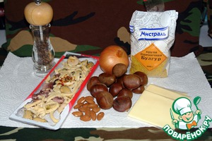 Соединить вместе булгур, каштаны, обжаренный лук, если нужно добавить специи (у меня специи уже были в прессервах, я не добавляла), так как у меня каштаны были суховаты я добавила 1 ч. ложку масла от прессервов.