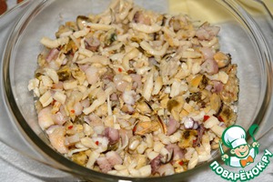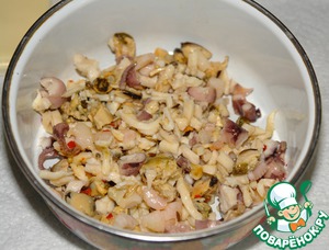 • Морепродукты измельчить, примерно, в кубик 0,5 см.
