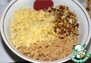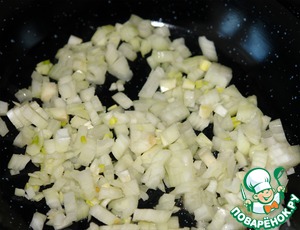 Лук порезать мелкими кубиками и обжарить на растительном масле (я использовала масло от прессервов).