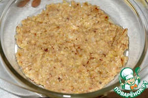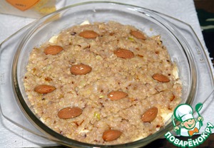 Разогреть духовку до 220 градусов. Форму для запекания слегка смазать маслом, выложить половину смеси, разровнять.