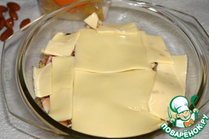 Сверху все "застилаем" сыром, я брала плавленый сыр, который уже нарезан и каждый упакован в пленку, можно брать любой сыр.