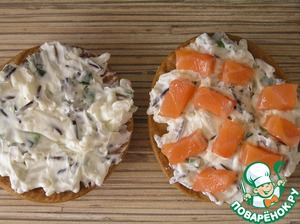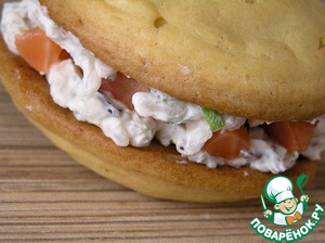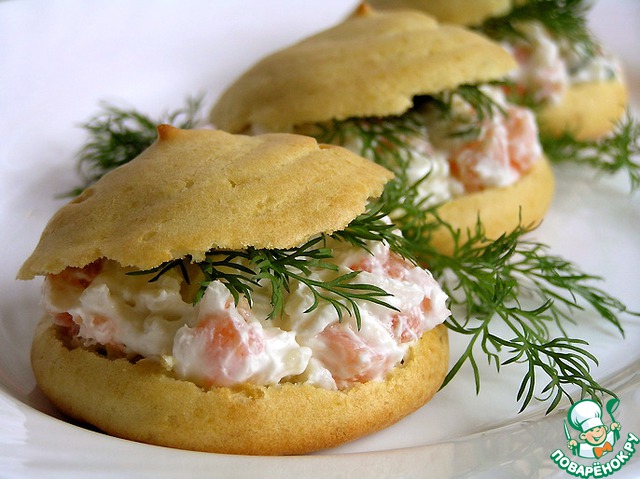 Надрезать эклеры, положить в каждый начинку и нарезанную небольшими кусочками форель. ***Я выложила начинку на каждый свой "эклер", на один из них положила кусочки форели.