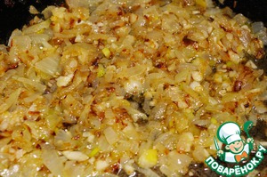 Лук и чеснок режем, обжариваем на масле до золотистой корочки, солим.
