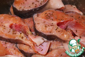 • Рыбу режем на кусочки толщиной 2 см., выжимаем на неё сок от половинки лимона, посыпаем тмином, добавляем ложку мёда, солим, перчим и оставляем мариноваться на 20 минут.