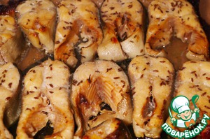 • Складываем маринованную рыбу в форму для запекания, промазанную сливочным маслом, и ставим в хорошо разогретую духовку минут на 20-25.