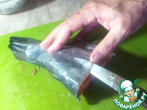 Кожа снимается очень легко, нужна только аккуратность, чтобы не прорезать её, но и это не страшно, т. к. кожа в любом случае удаляется. Ну, вот, получается вот такой обработанный участок рыбной тушки, который надо разметить.