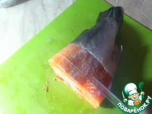 Через сутки - это минимальный срок, я вынимаю форель и горячим ножом (нож нагревается под струёй горячей воды) поддеваю кожу на замороженной рыбе. -
