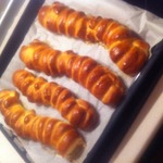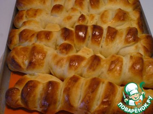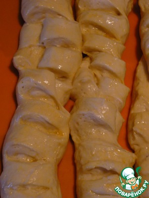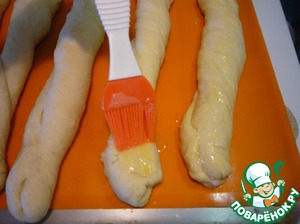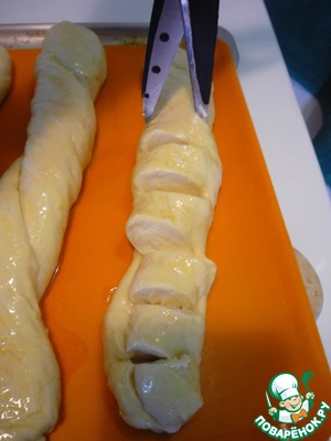 Сворачиваем рулетом и чуть-чуть перекручиваем. Складываем на застеленный пергаментом (у меня силиконовый коврик для выпечки) противень.