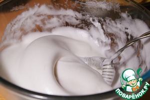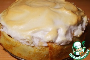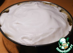 Смазываем белками наш пирог сверху, накрываем блином и выкладываем оставшиеся взбитые белки.
