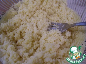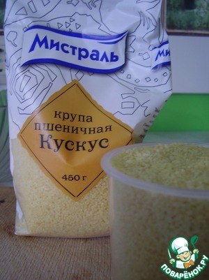 Приготовить крупу Кускус фирмы "Мистраль". Для этого крупу залить 250 мл кипятка, накрыть крышкой и оставить на 5 минут.