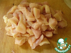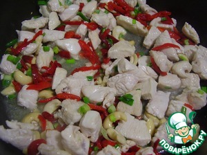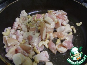 Куриное филе обжарить с кешью на раскаленной сковороде 5 минут.