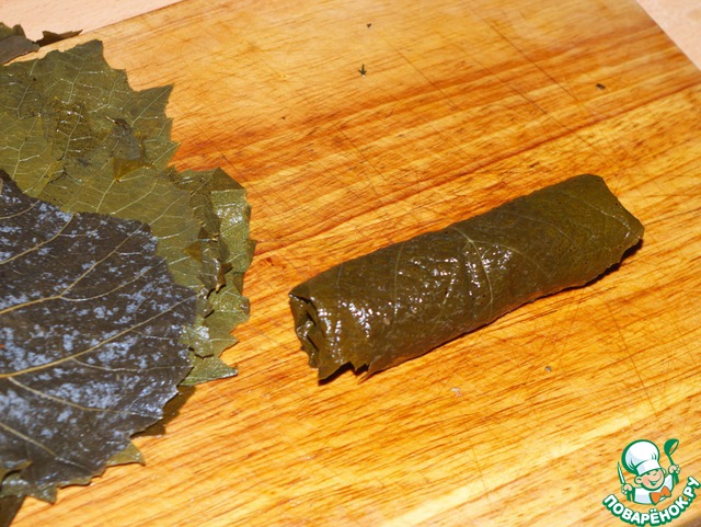 На широкую часть виноградных листьев положить по одной столовой ложке фарша, аккуратно свернуть трубочку-долму.