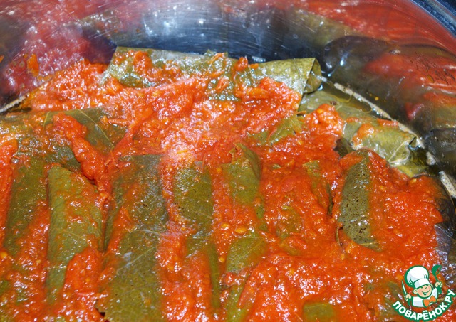 Выкладывать долму в кастрюльку с толстым дном (дно застелить виноградными листьями), плотно прижимая их друг к другу, залить водой так, чтобы чуть-чуть прикрывала долму. Добавляем оливковое масло, томатный соус, слегка солим, перчим, добавляем ложечку сахара и тушим до готовности.