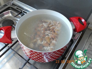 По рецепту. Я не очень поняла зачем их именно варить, можно было бы обжарить и потушить с овощами, по трудозатратам примерно то же, ррезультат такой же, но кастрюлю мыть не надо