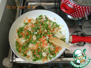 • Добавить овощную смесь к луку, перемешать, обжарить 2-3 мин.