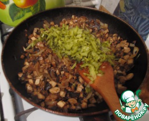 Для начинки: грибы режем кубиками, лук режем четверть кольцами, огурцы трем на крупной терке. Сначала обжариваем лук до золотистого цвета, затем добавляем грибы, тоже обжариваем до золотистого цвета, затем добавляем огурцы и томим их 1-2 мин.