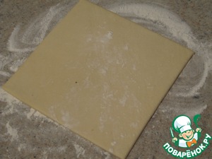 Раскатываем квадрат в прямоугольник. Разрезаем на 6 квадратиков. Т. е. из 2 листов теста у нас получится 12 изделий.