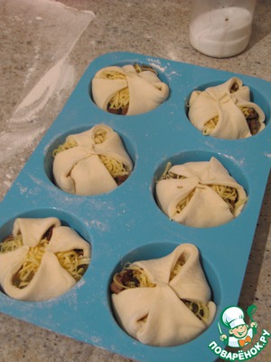 Выкладываем начинку - примерно 1 ст. л с горкой. Присыпаем тертым сыром, чтобы "запечатать" начинку, примерно 1 ч. л.