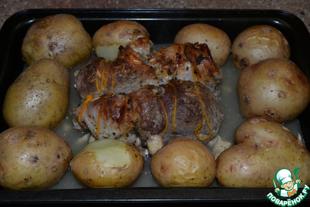 Выкладываем готовые рулетики на противень, добавляем на мытую картошку в мундире и ставим запекаться.