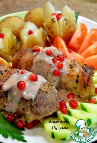 Соус: горсть брусники протереть через сито, мякоть добавить в сливки и немного упарить. Всё, соус готов. -