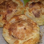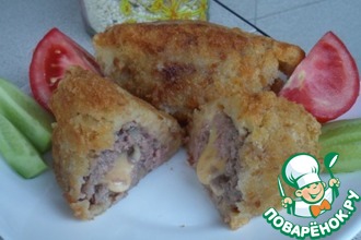 берем наши колечки фаршируем их фаршем, поддерживаем снизу чтобы не выпал он. Затем обмакиваем хорошо колечко во взбитое яйцо, следом так же тщательно в муку и отправляем на сковороду в разогретое растительное масло, обжариваем на небольшом огне с обеих сторон до образования румяной корочки. -
