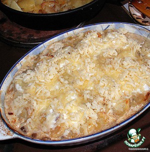 Затем вынимаем форму из духовки и посыпаем подрумяненный сверху картофель остатками тертого сыра (их должно быть прилично).