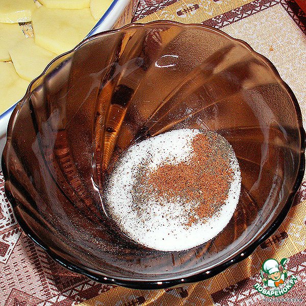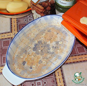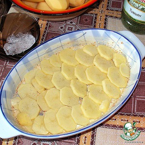 Дно формы покрываем слоем картофеля, который посыпаем смесью соли с пряностями.