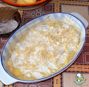 Смешиваем в миске сметану и 1 стакан молока. Поливаем картофель двумя столовыми ложками этой смеси и посыпаем одной столовой ложкой тертого сыра.