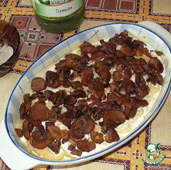 Снова кладем слой картофеля, его снова посыпаем солью и пряностями, заливаем сметанной смесью (2 столовые ложки), укладываем слой грибов (их как раз на 1 слой и хватает).