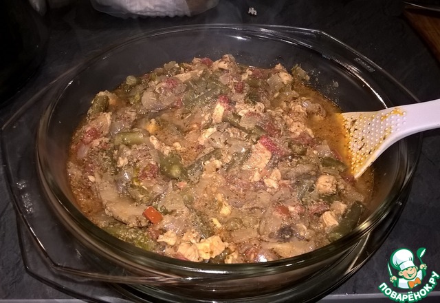 Добавляем замороженную стручковую фасоль, закрываем крышкой, убавляем огонь на минимум и тушим до готовности фасоли, периодически помешивая. Пробуем на соль, при необходимости досаливаем.