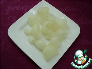 Сольем кипяток, обдадим холодной водой и разделим лук на чашечки. Оставим наиболее крупные и красивые, остальные мелко порежем.
